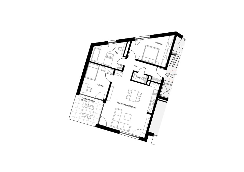Hier ist keine Wohnung wie die andere: Jede der Mietwohnungen besticht durch ihre individuellen Grundrisse, die bewusst mit den Standards des klassischen Geschosswohnungsbaus brechen.